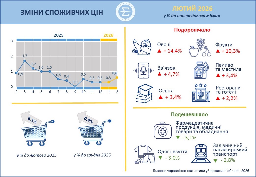 "Зміни споживчих цін у Черкаській області в лютому 2026 року"